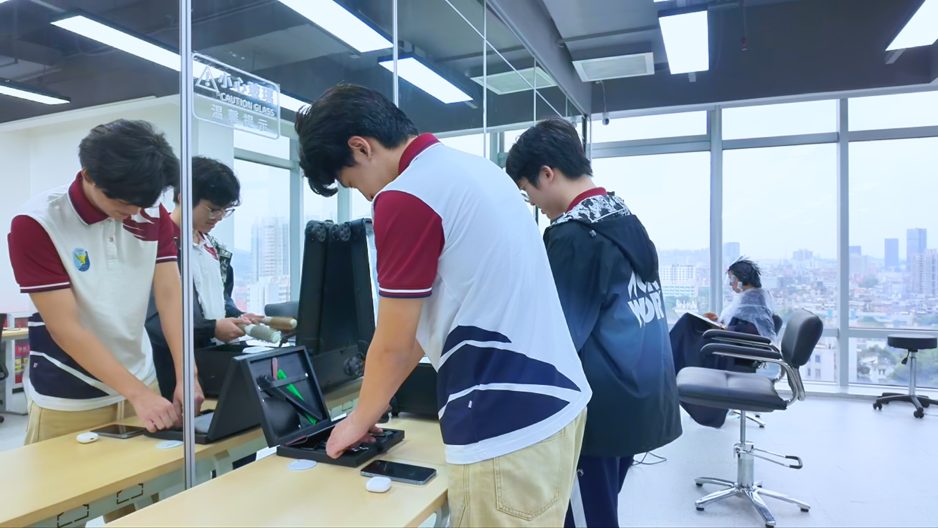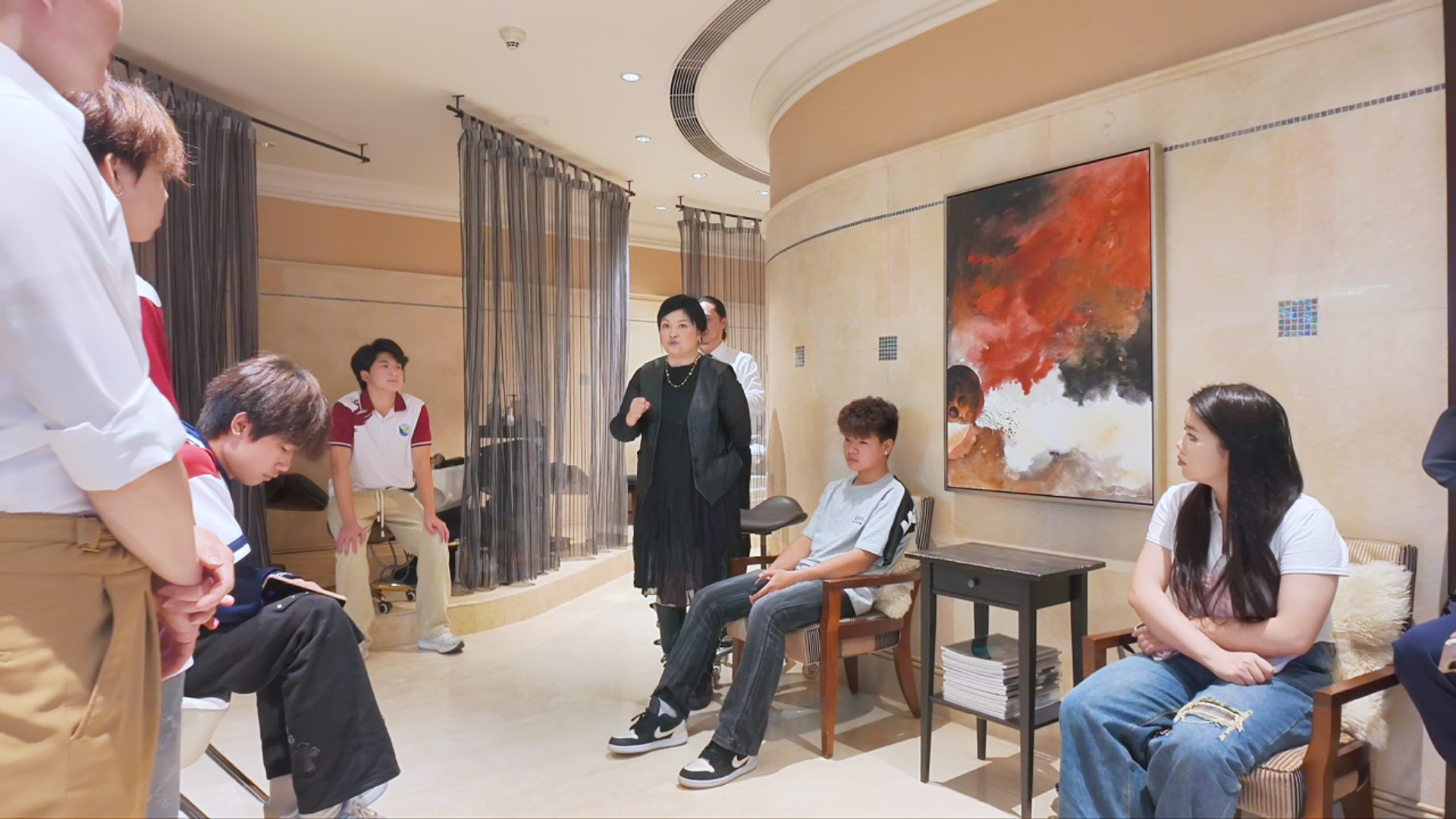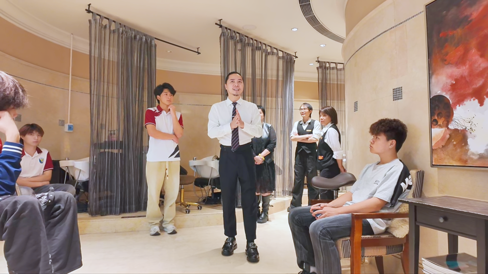 学子们近距离观察高端沙龙的空间布局、服务流程,认真聆听导师讲解国际美发品牌的经营理念、潮流趋势,以及发型师的服务细节与技艺要点。